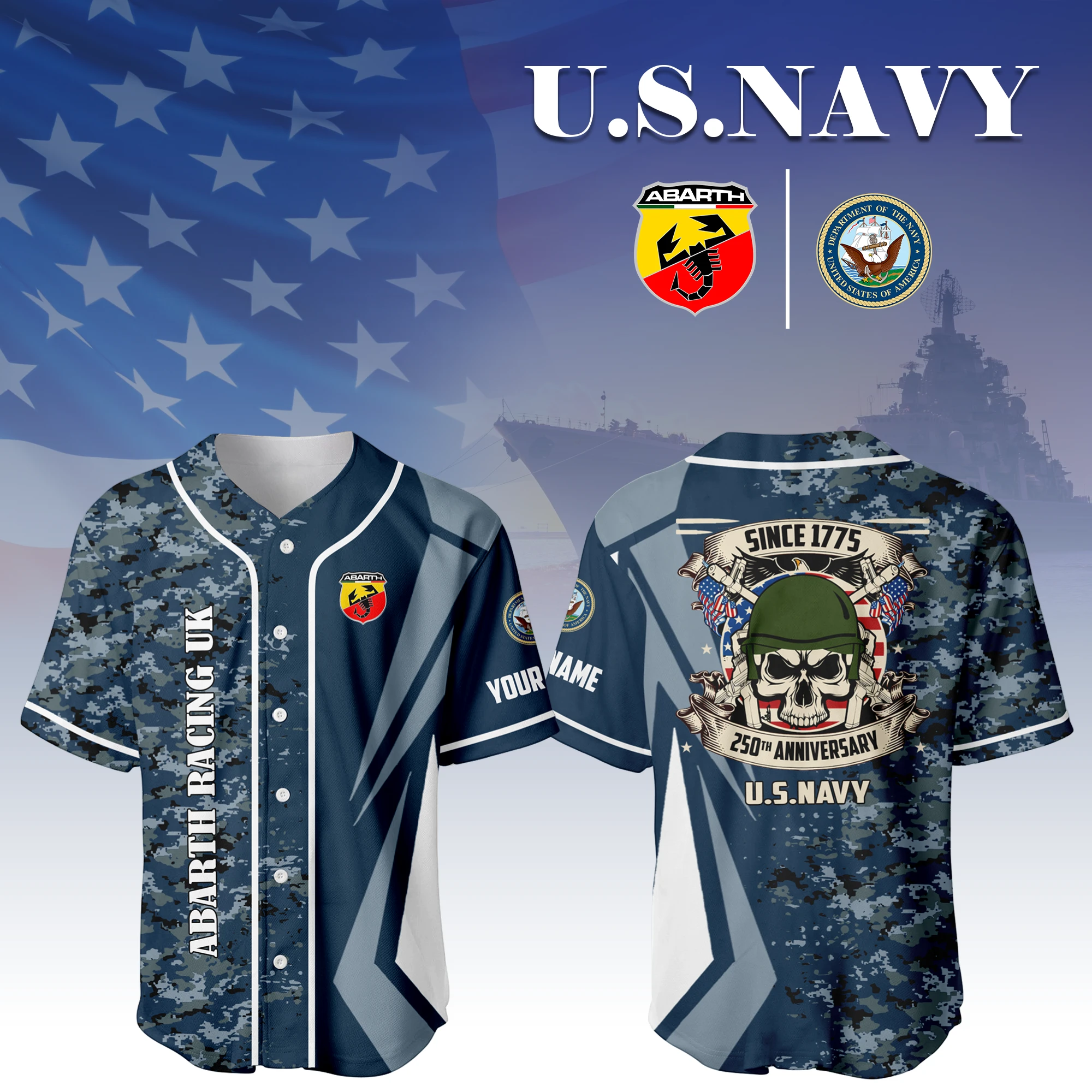 Abarth Racing UK x US Navy 250th Anniversary 3D Baseball Jersey Custom Your Name