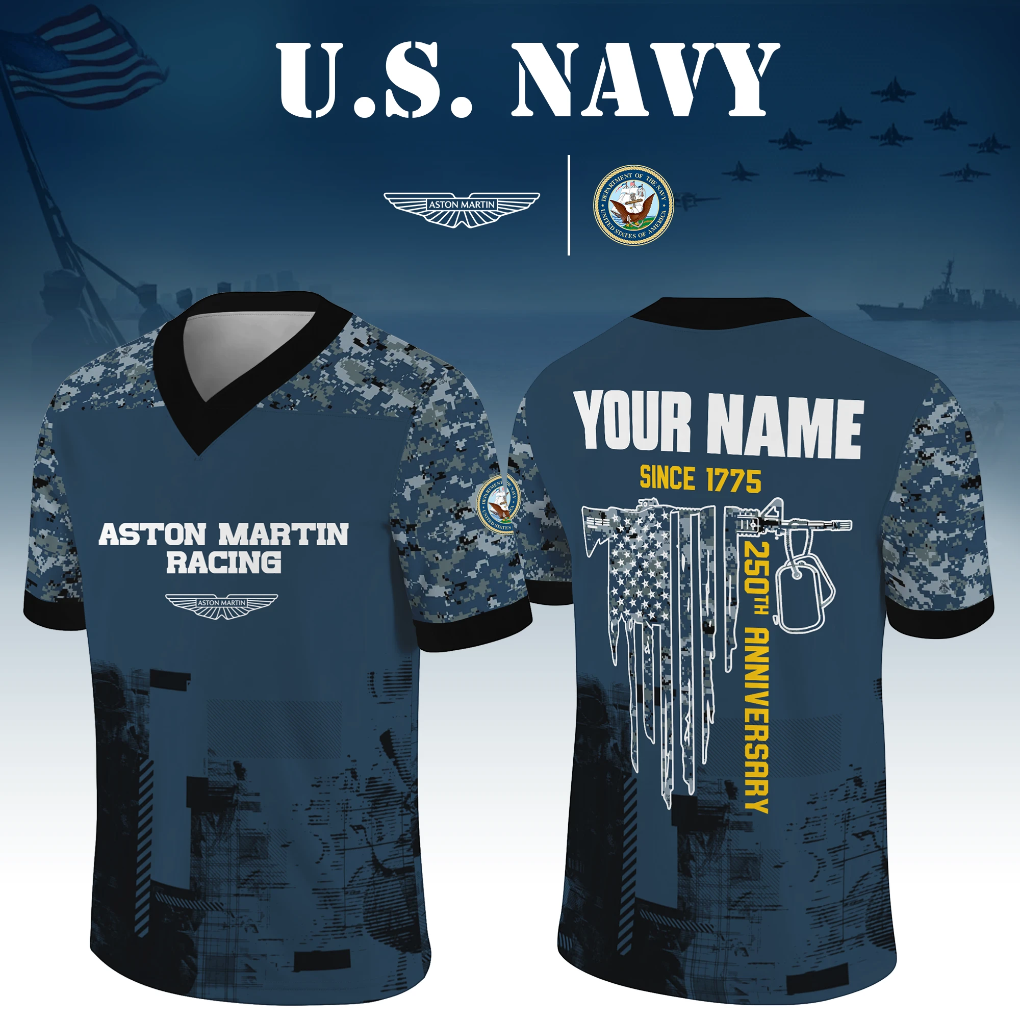 Aston Martin Racing x US Navy 250th Anniversary V-Neck Short Sleeve Jersey 3D Limited 2026 Custom Your Name