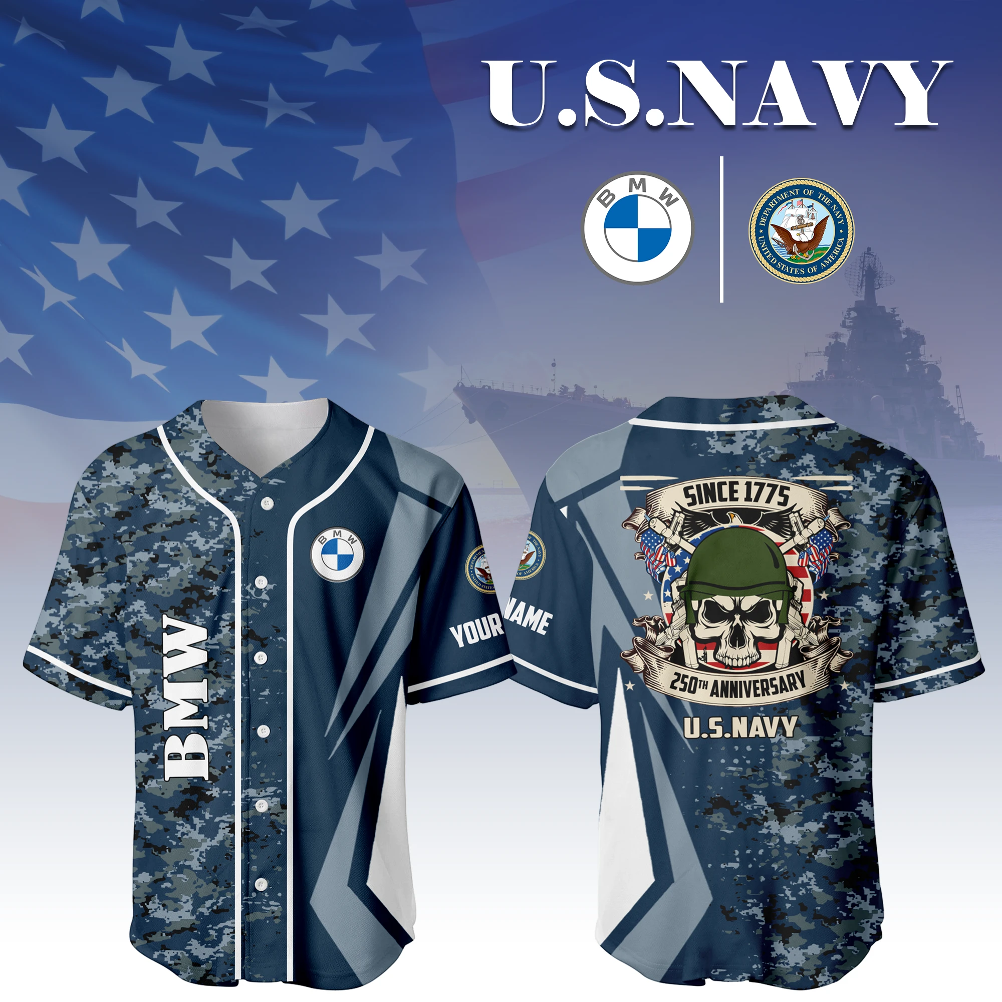 BMW x US Navy 250th Anniversary 3D Baseball Jersey Custom Your Name