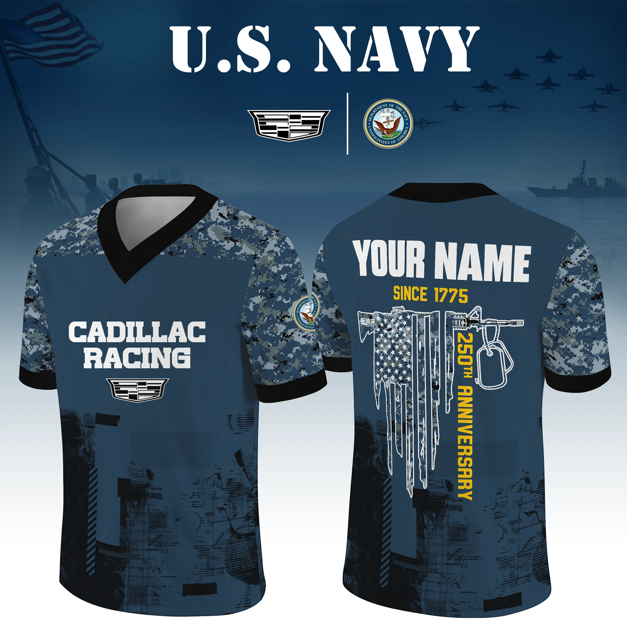 Cadillac Racing x US Navy 250th Anniversary V-Neck Short Sleeve Jersey 3D Limited 2026 Custom Your Name