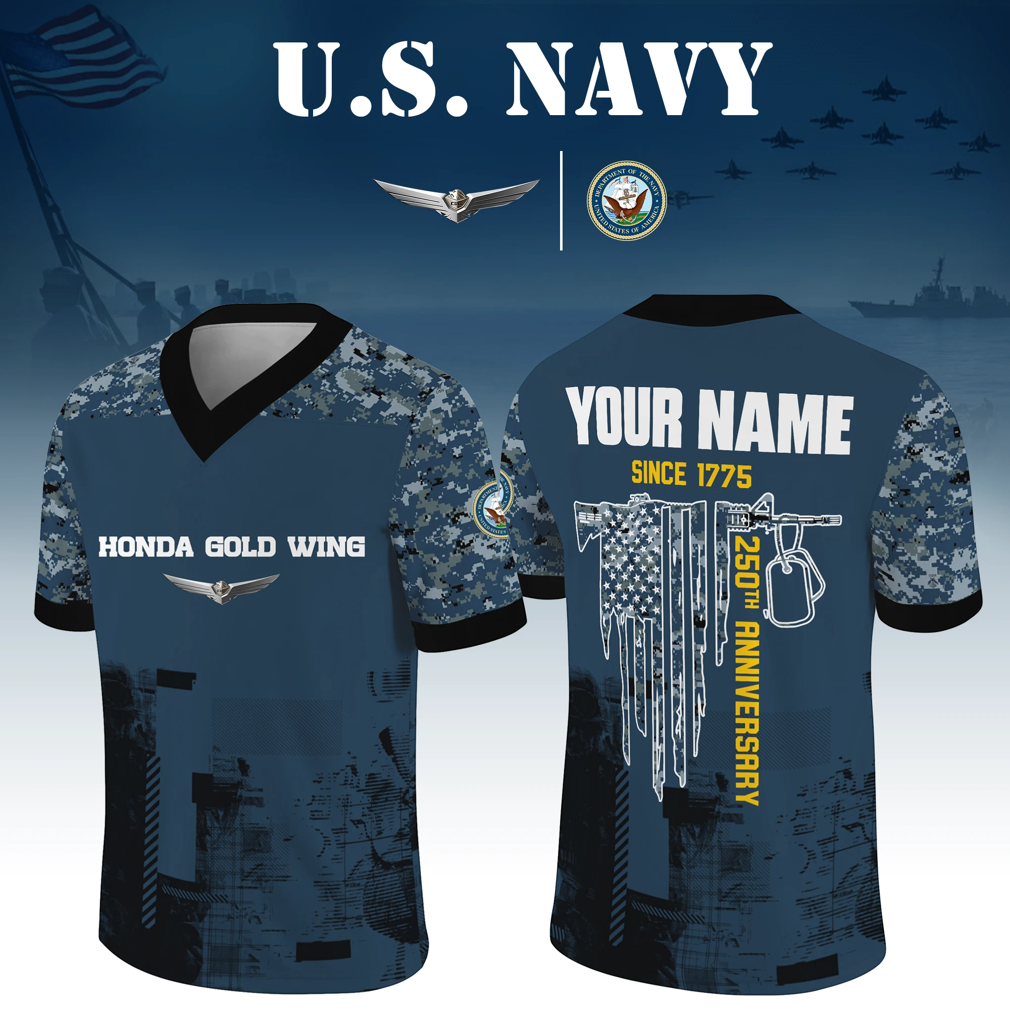 Honda Gold Wing x US Navy 250th Anniversary V-Neck Short Sleeve Jersey 3D Limited 2026 Custom Your Name