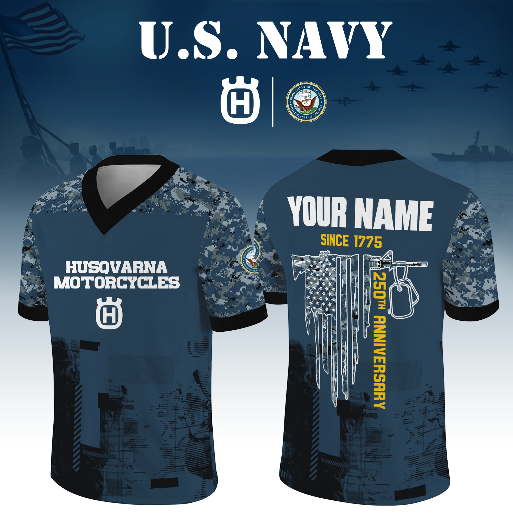 Husqvarna Motorcycles x US Navy 250th Anniversary V-Neck Short Sleeve Jersey 3D Limited 2026 Custom Your Name