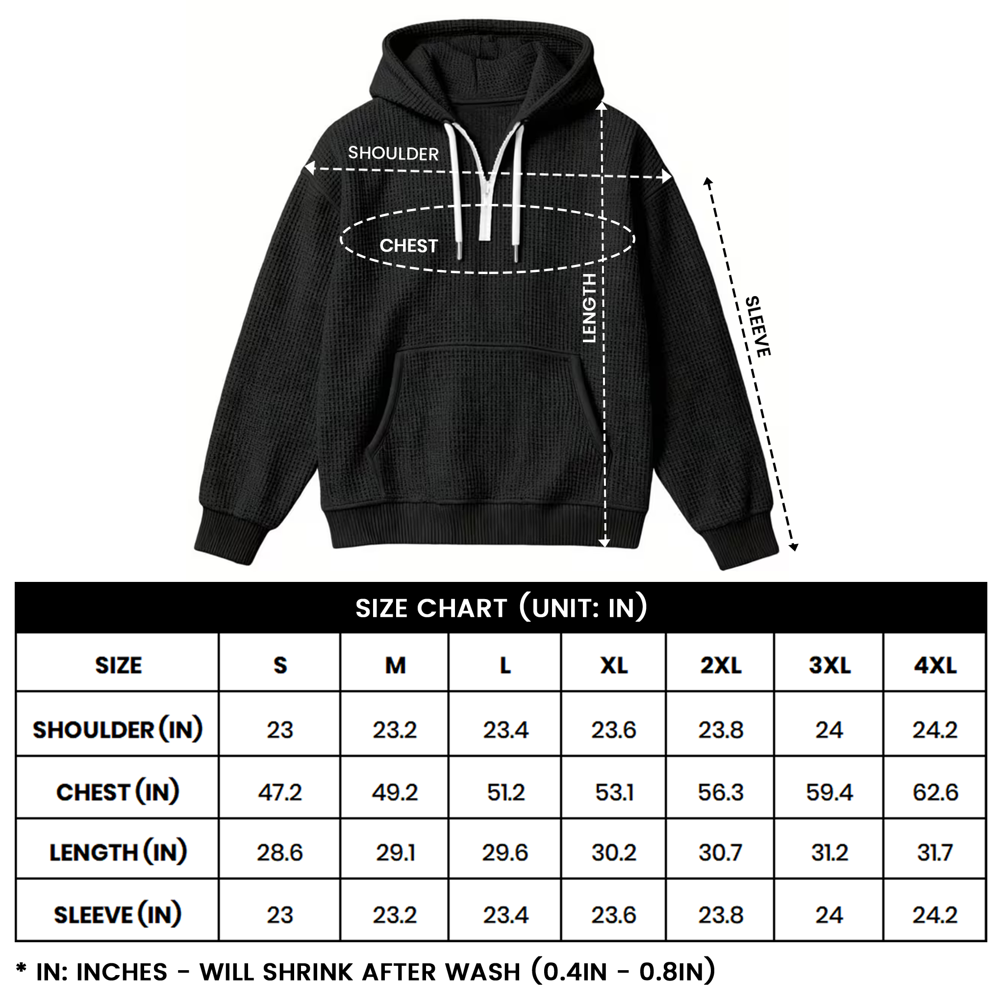 Design Type: Quarter-Zip Pullover Hoodie with Waffle Knit Texture.