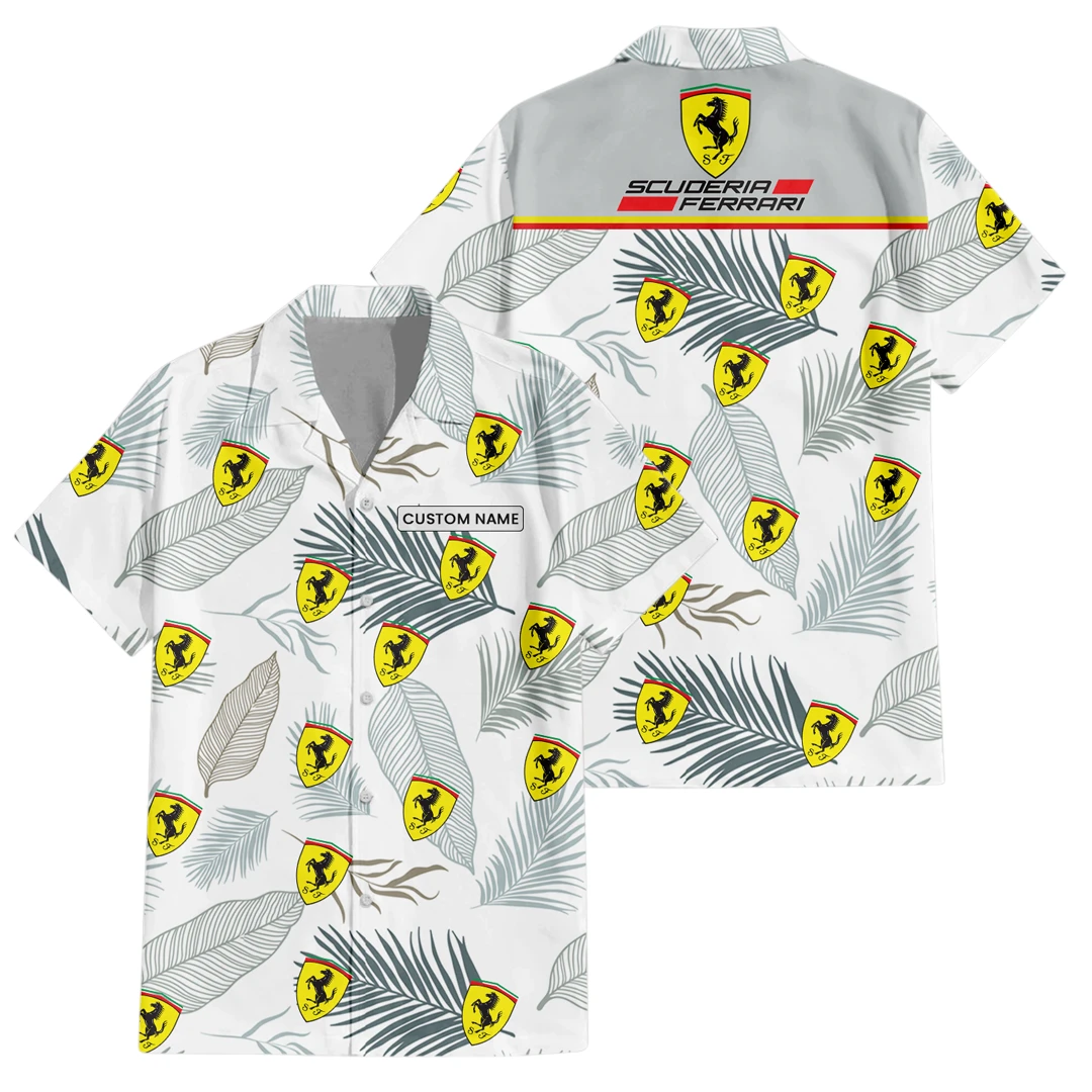 Scuderia Ferrari Exclusive Logo Button Up Hawaiian Shirt Tropical Leaves Seamless Pattern All-over Print, Custom Name HIHI190225Y7HWLS1SCF