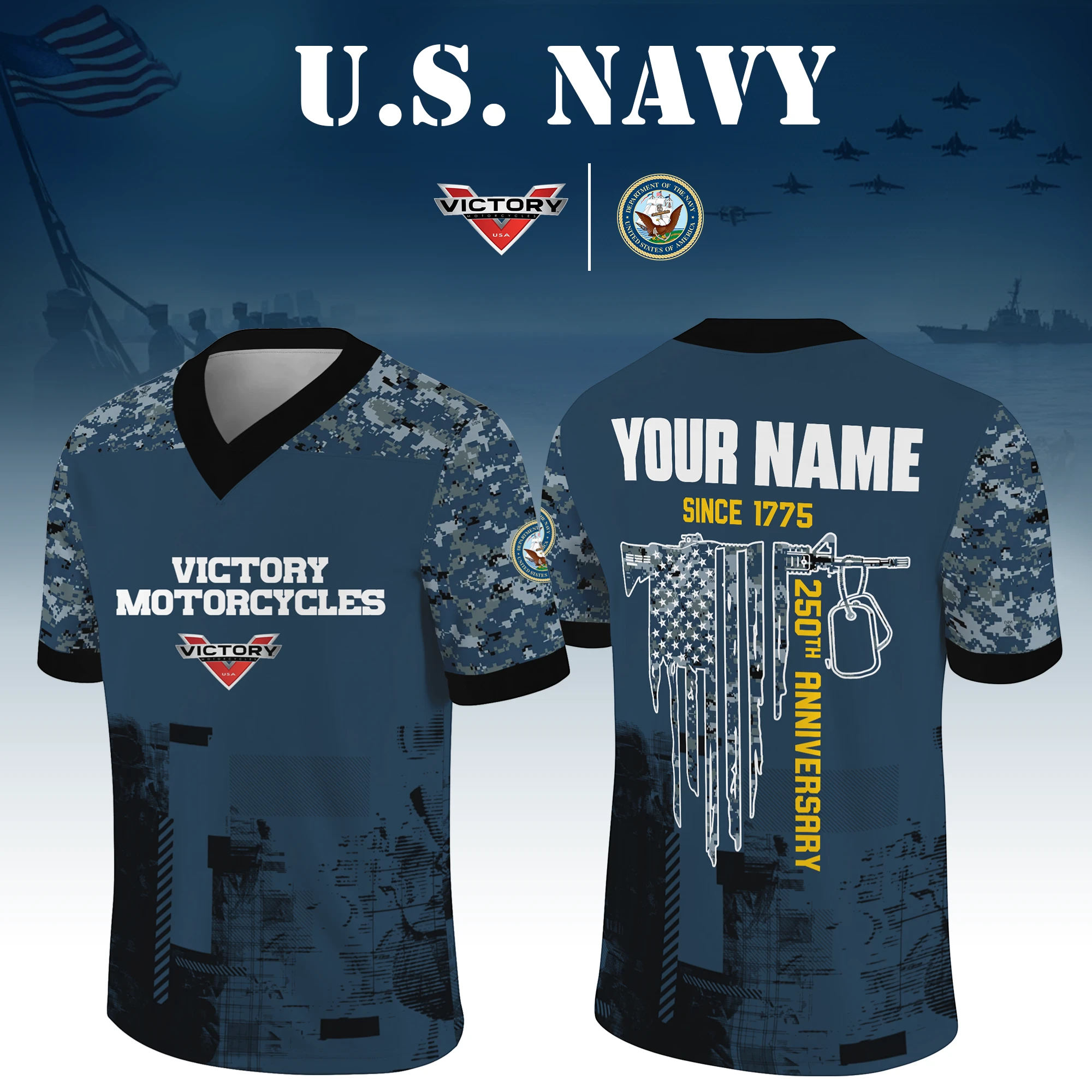 Victory Motorcycles x US Navy 250th Anniversary V-Neck Short Sleeve Jersey 3D Limited 2026 Custom Your Name
